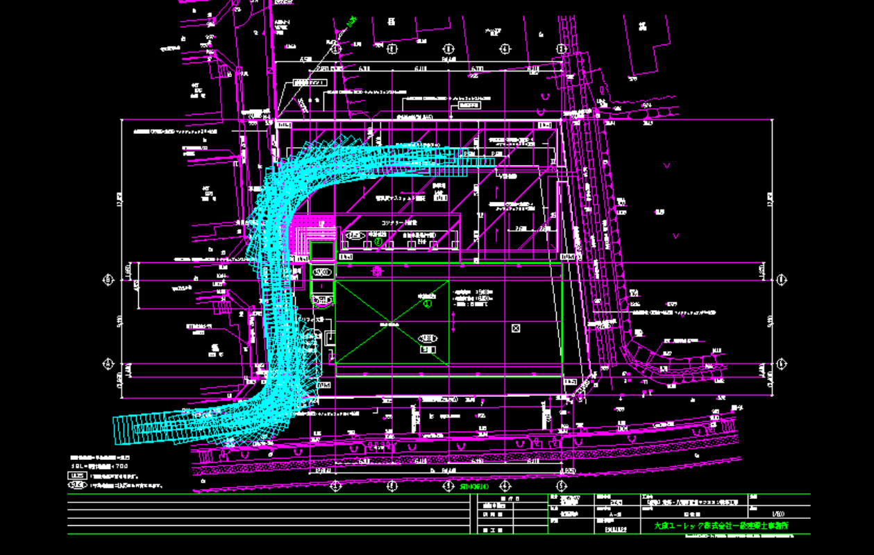 ラフタークレーン・オールテレンクレーンの侵入も専用のCADシステムにより進入軌跡図をその現場に合せてご提案しています。